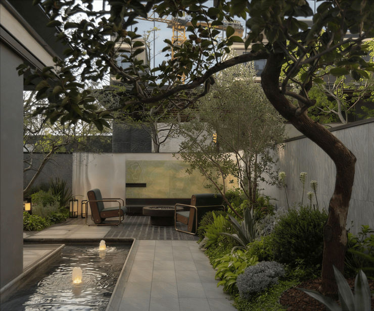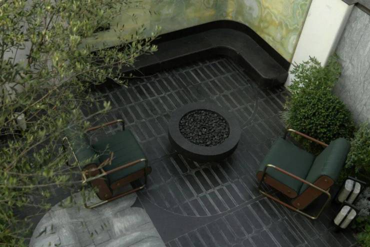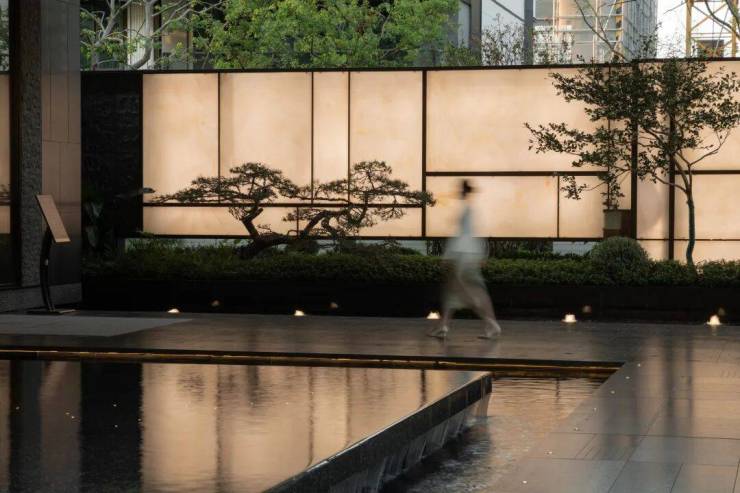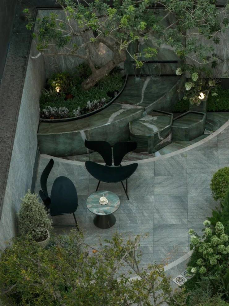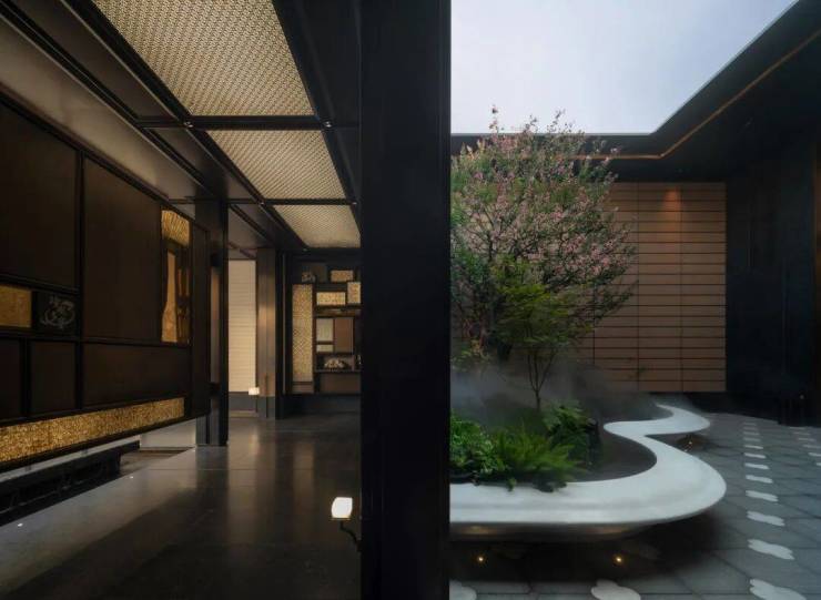 水自山出,叠石造山作为视觉焦点,同时以水声覆盖城市噪音,创造“山深不知处”的沉浸感.