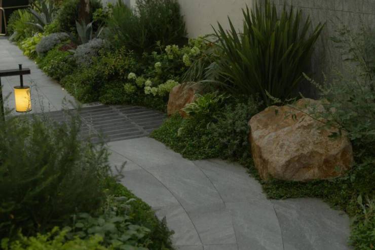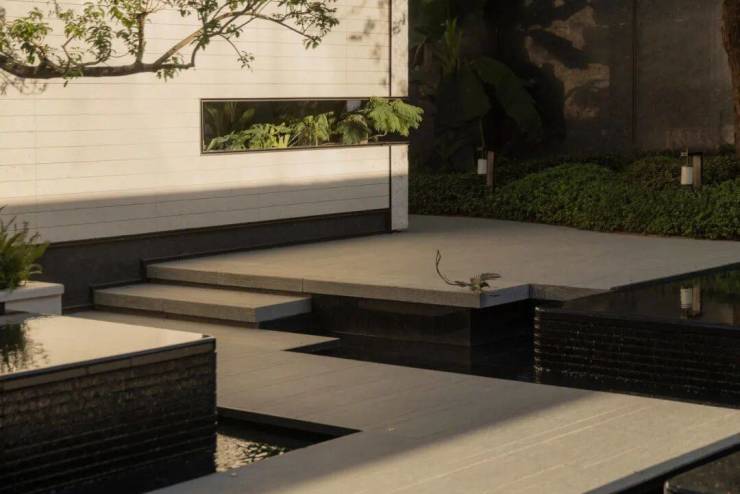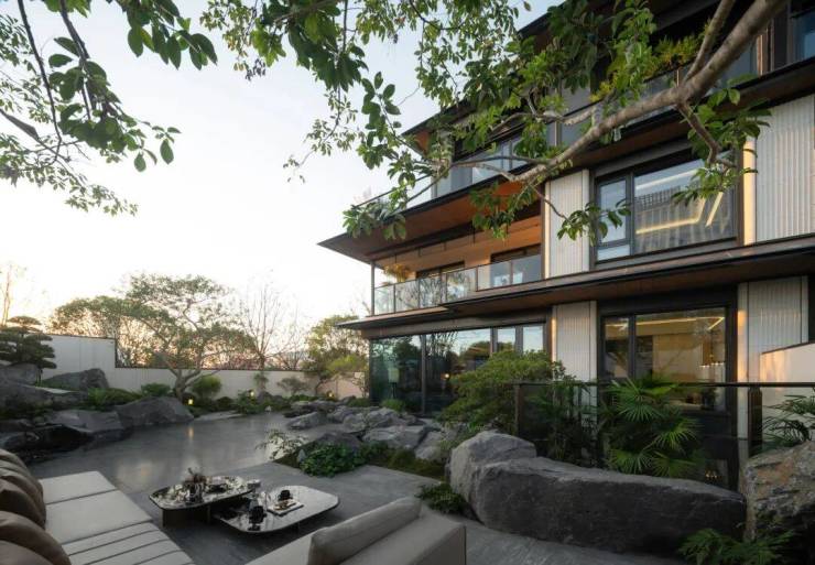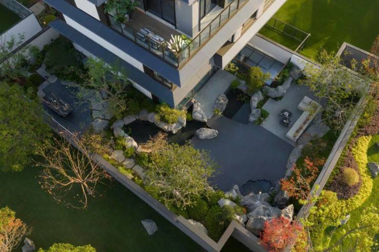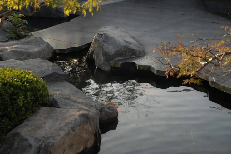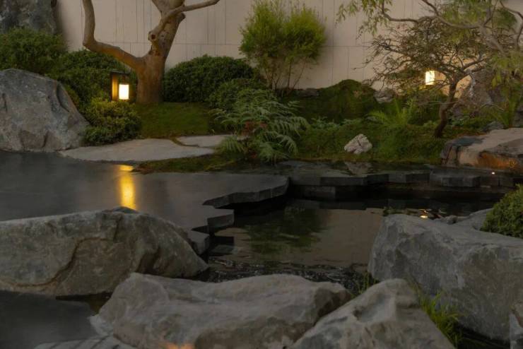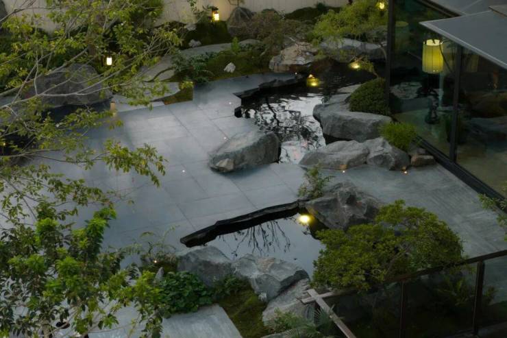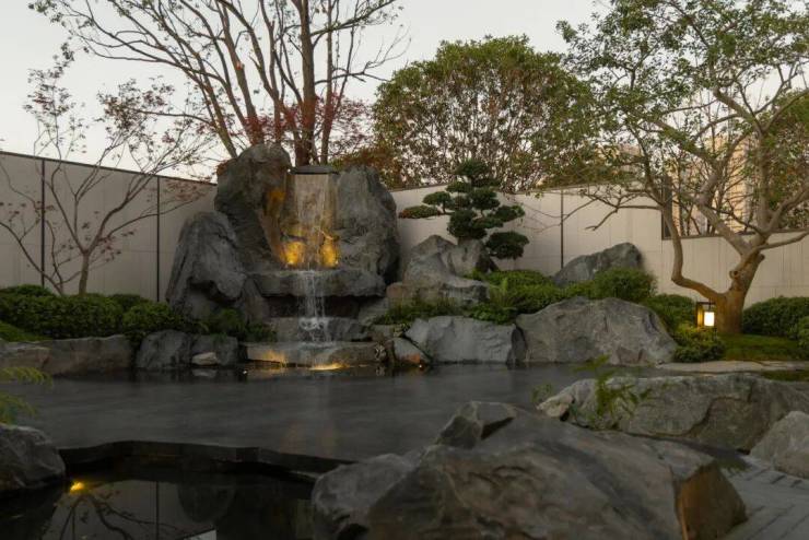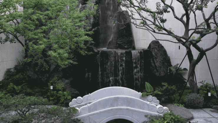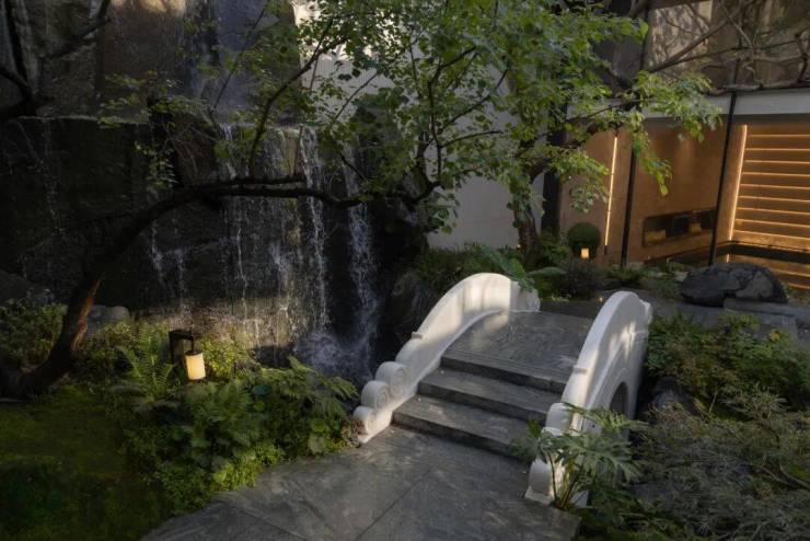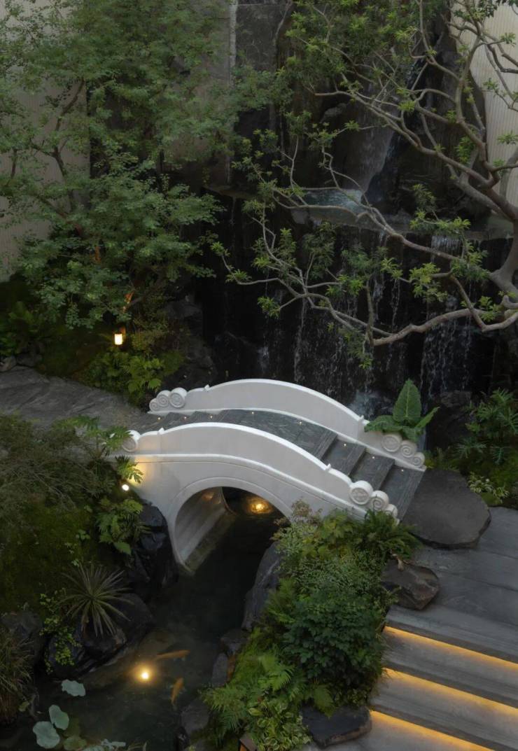 以苏州园林“咫尺山林”的造园哲学为灵感,通过山石、流水、拱桥、平台的起承转合,再现《林泉高致》中“可行、可望、可游、可居”的山水画境,打造“一桥渡云影,一石藏洞天”的诗意栖居。