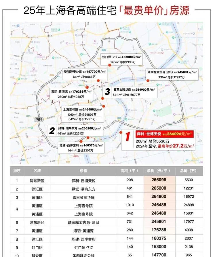 2025上海豪宅单价超20万/m²的成交量排行中,保利世博天悦甚至力压新天地、外滩、陆家嘴、苏河湾、徐汇滨江等一众热门板块新盘,问鼎上海豪宅之巅!