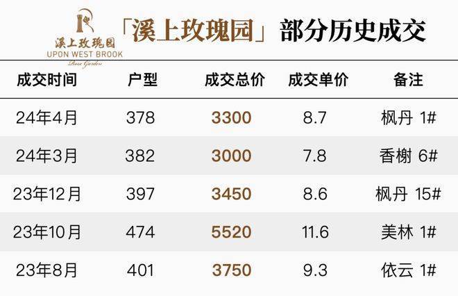 「溪上玫瑰园」近几年,年成交量都在3-4套左右,总价相对稳定,澜溪、香榭总价最低,普遍在2300-2800万之间,二三期以3000-4000万级为主力,美林苑报价基本在5000万以上。