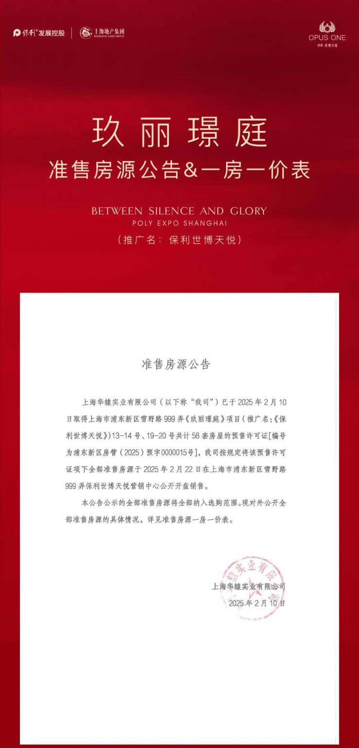 1、项目推广名为“保利·世博天悦”,地名核准名/备案名为“玖丽璟庭”,开发公司为:“上海华辕实业有限公司”;预售证号:浦东新区房管(2025)预字0000015号;2、本资料为要约邀请,不作为要约或承诺;3、相关宣传内容不排除因政府相关规划、规定及出卖人分期规划、未能控制等原因而发生变化;4、买卖双方的权利义务以双方签订的商品房买卖合同及其补充协议、附件等书面文件为准;5、本宣传材料所涉及户型仅供示意参考,具体以政府部门最终审定的图纸和销售合同为准,本资料所涉及面积皆为预估面积,相同户型单位因楼栋、楼层、单元等差异,局部结构、形式、面积、装饰等可能有所不同,且预估面积与实际面积可能存在差异,面积最终以房管局测绘为准。户型图中装修、家具、电器等设备仅为示意,不属于交付内容和交付标准,实际部品的选型和房间空间尺寸根据户型情况,略有差异,以现场实际为准;6、本宣传资料中涉及的价格、折扣、付款方式等信息,因销售时间、户型楼栋、楼层、方位等不同有所差异,以双方签订的商品房买卖合同及其补充协议、附件等书面文件为准;7、本资料所发布的内容为2025年2月的信息,敬请留意最新资料。
