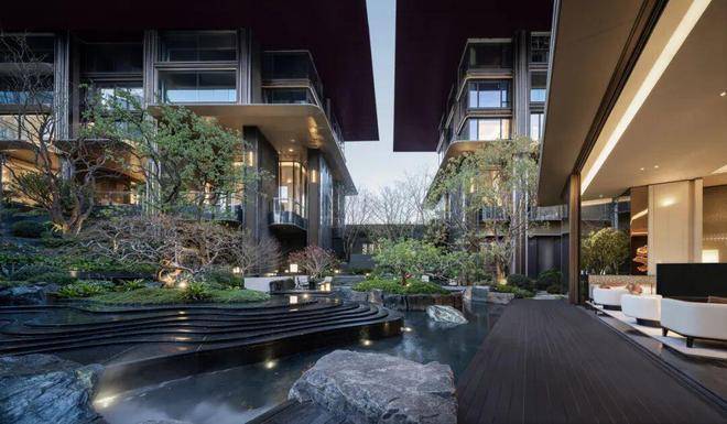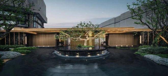 晴时在山川溪谷式景观中赏树、赏石,享受玉扣绿岛的天地自然,感受风籁禅境的空灵静谧,还可以在下沉庭院的层层叠水设计中疗愈身心;雨时在艺术大堂与艺术长廊中与匠人魂魄进行一场时空对话,在社交会客厅中谈古今,道中外。