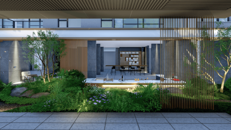 约7000㎡中轴景观,涵盖约3500㎡多功能中央草坪和约200米景观长廊,日常簇拥花间草木,让建筑与绿意和谐生长。