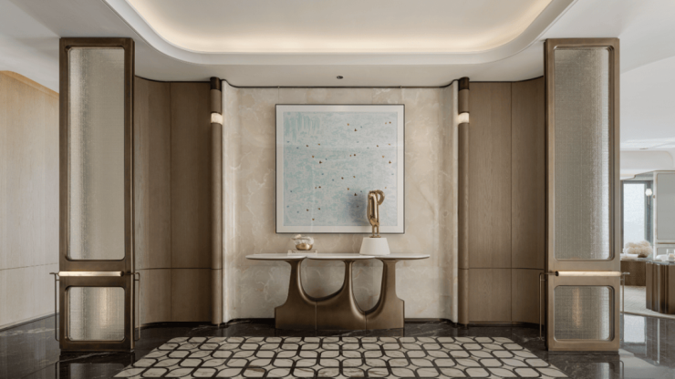 透过鞋柜看向过道,门全部做了到顶的处理,中间的腰线在公共开放区域是整体贯穿的元素,并结合柜门的开启高度,硬包的中线高度等等做了一个整体的联系。