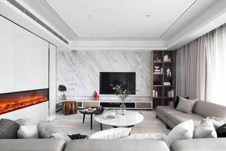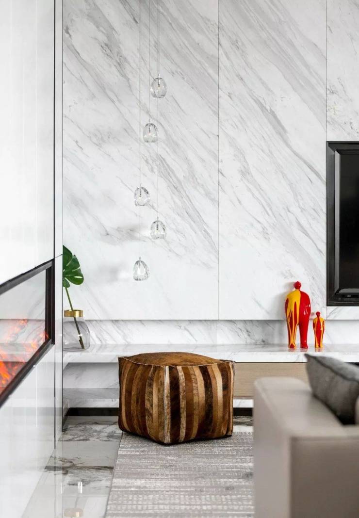 开放式的客餐厅设计,吊顶侧边一些细节的处理与柜子的钢条和大理石的分缝有一些联系,整体立面的横向缝隙的高度都有一些相应的联系,让空间的感受更为整体并且相互之间有一些联系。