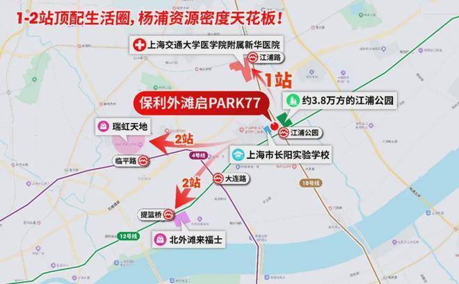 更难得的是,1-2站范围内,三甲新华医院、北外滩来福士、瑞虹商圈、江浦公园、长阳实验学校等顶配资源一应俱全。