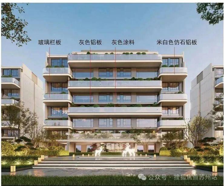 洋房外立面则是灰色涂料、灰色铝板、米白色仿石铝板和玻璃栏杆!