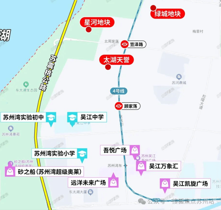 在交通方面,项目与地铁四号线的笠泽路站和顾家荡站距离较近,为居民的轨交出行提供了便利。此外,项目西面毗邻苏震桃公路,自驾出行同样便捷,可直接连通市区。