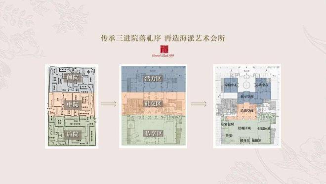 整个会所的空间布局和传统的环绕式完全不同,采用三进院的的布局设计,一层一层递进,功能在里面纵向分布。