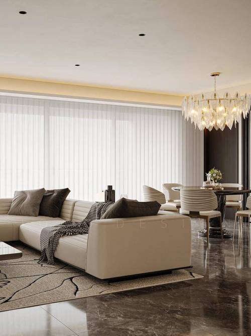 客厅选用芬迪白奢石作为背景墙,搭配金属框线,加强空间价值感。