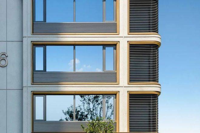 滨纷城便把建筑侧边做了圆弧角设计,南向外立面采用白色铝板、局部金属格栅等组合,金属线条用了经典9号库金色,远远望去,白金色搭配大气醒目。