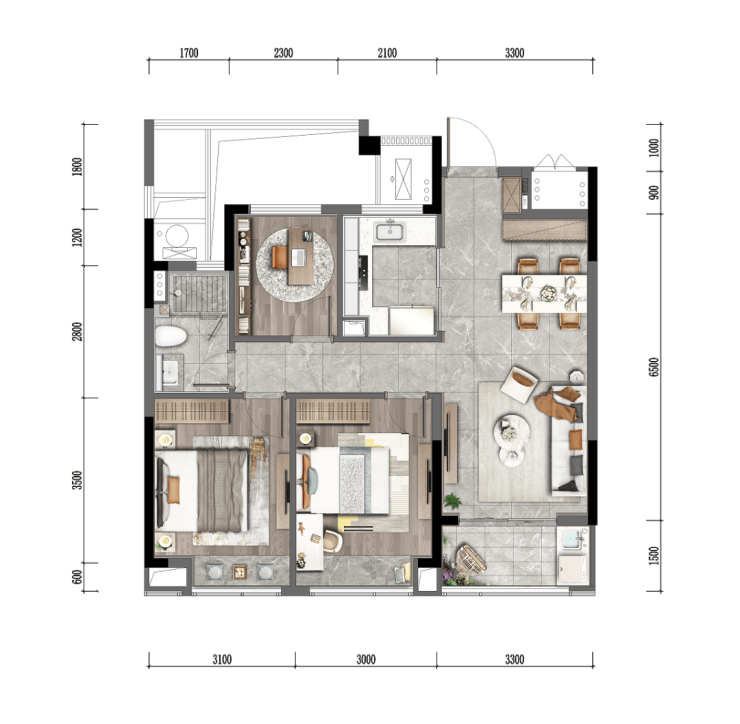 南向双联阳台,整体长约6.6米,观景&居家储纳皆宜;约6米餐客厅采光面,进深约4.5米,超25方的餐客厅面积远超市面上同类产品;厨房在餐客厅的正北面,采光优秀,冰箱的预留尺寸同样可以满足双开门;自带一个储藏室,换季收纳便利、舒心。