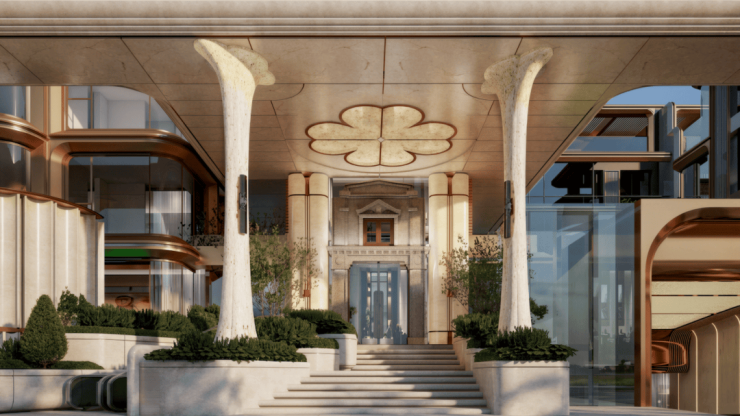 点睛之笔在于珐琅的运用。这一源自宫廷的传统工艺,以现代转译的方式嵌入建筑肌理,在香槟金与石材的主色调中跃然而出,为立面增添了一抹深邃的文化质感。