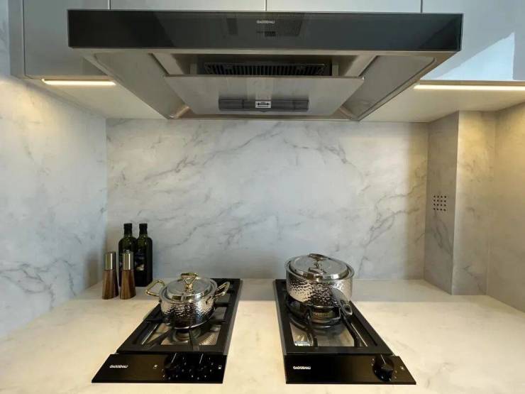 厨电方面,是嘉格纳品牌,包含了三眼灶、油烟机和洗碗机。弗兰卡大单槽,配备中央净水。