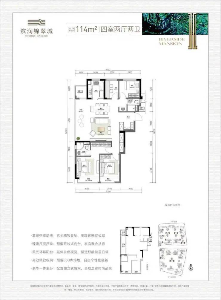 改善边套户型:建面约114方四房两卫,拥有独立入户玄关、客餐厅+封包阳台、南向主卧套房+次卧……4房功能一步到位。