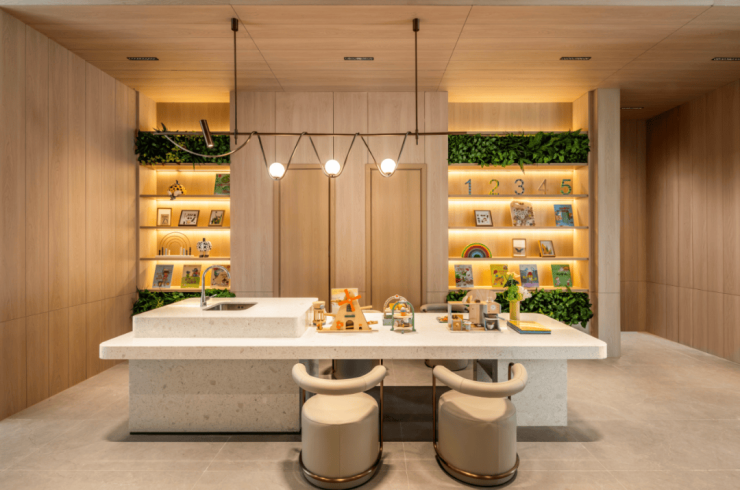 项目利用萧绍运河支流的滨水优势,打造杭州首个运河入园滨水楼盘,在约10000方沿河景观带上,设计了街角休闲座椅、大片阳光草坪,不必提前去占位,下楼就能露营、飞盘、遛狗等。