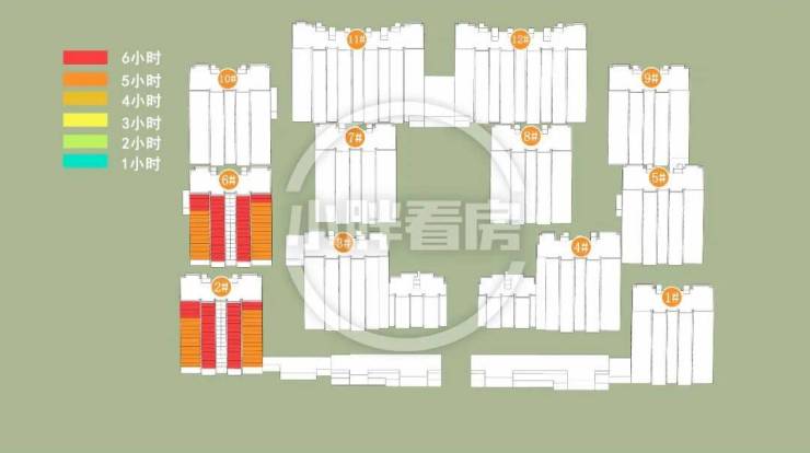 冬季:2#采光优异几乎不存在遮挡。6#中低层受遮挡。就具体遮挡时间而言,6#除傍晚外其余时间段均受遮挡。