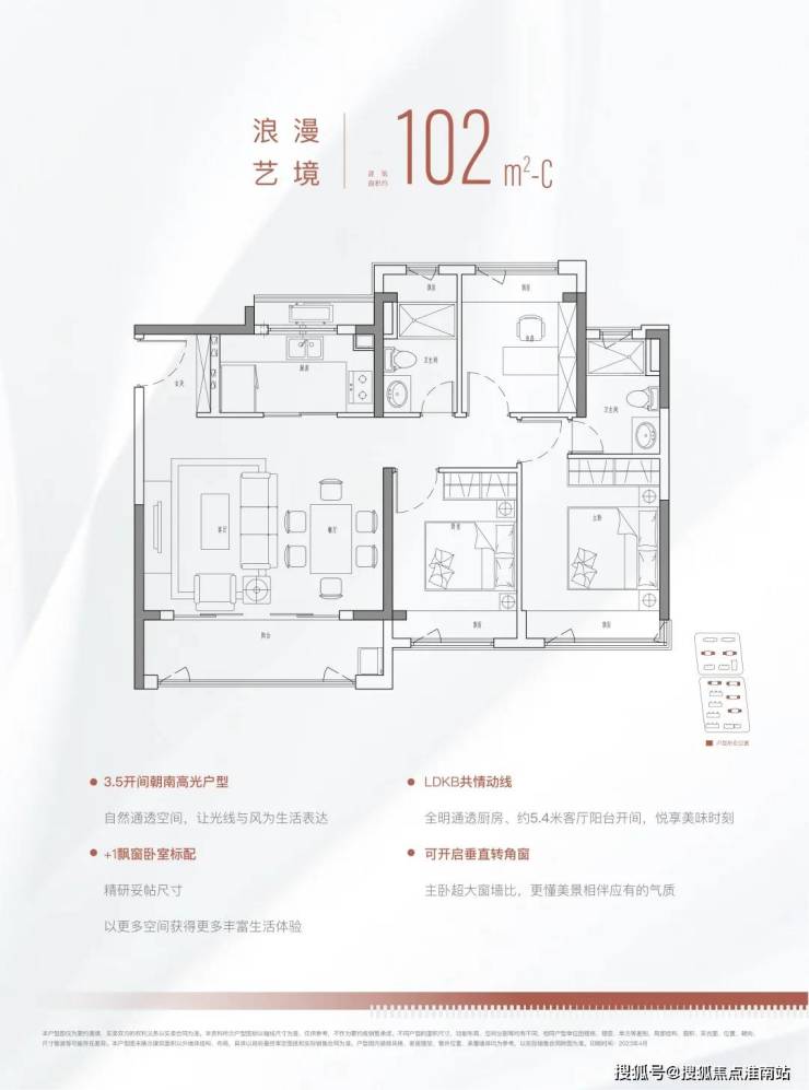这个户型相信年轻人更喜欢,毕竟,哪个年轻人会拒绝270度采光的客厅呢!这套户型同样拥有约80%的高得房率、灵活机动空间等优点,而且布局上隐私性更强、窗墙比更高!主卧和次卧是完全隔断的,从归家动线上来看,主次卧的轨交动线几乎不重叠。这种设计很适合两代同住的家庭,因为很多年轻人因为下班晚,是不希望打扰到长辈的。南向窗墙比达到约41%-45%,空间通透感十足!租住过上海老公房的朋友很多都对高窗墙比有一定执念,这个户型相信打动了不少人的心!102m²的户型也很难让人不爱: