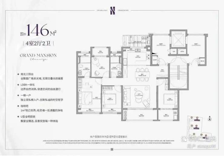 建面约143㎡的4房户型,类一梯一户的设计,每一户都有一个面积约8㎡的独立采光电梯厅空间;四开间朝南+大宽厅,采光效果爆棚;通过LDKB一体化设计,形成一个近50㎡的客餐厅空间,极大提升空间场景的可能性;卧室也采用了酒店化套房设计,主卧贯穿南北套房设计,南北皆有飘窗。