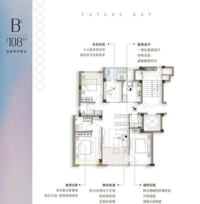 餐客厅开间6米,面积达到约60方,媲美200方大平层居住体验,主卧采用270度飘窗设计,可更好的提升主卧采光及景观。