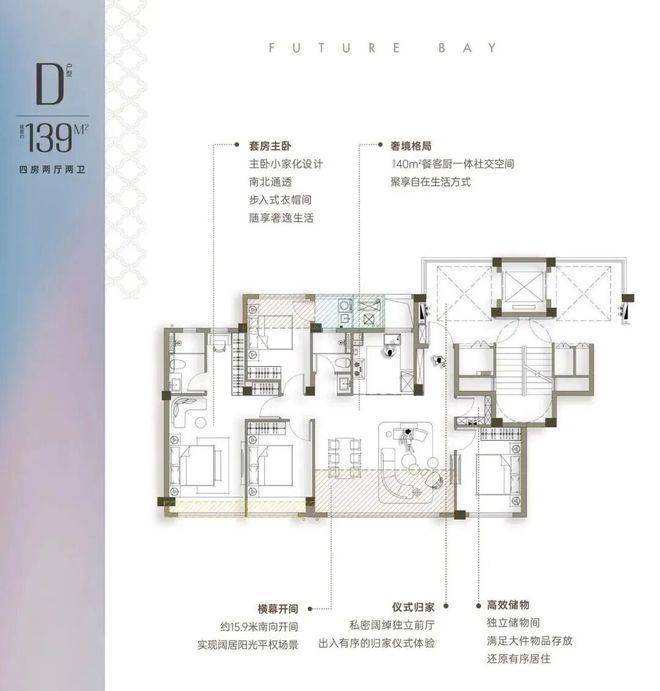 约139方户型,4.5开间朝南+储藏间,南向15.9米超大采光面,做到五开间朝南的空间,标配储藏间,三个南向卧室设计。