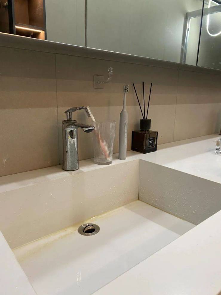 时间久了,不仅丑,还容易漏水。建议选择圆角或一体成型的洗手池,更耐用也好维护。