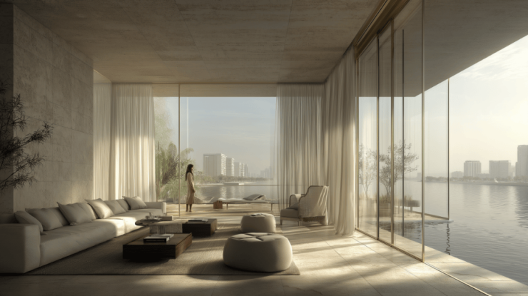 约10米南向巨幕面宽,配上270°转角全景主卧,把整个黄浦江和复兴岛都变成了家的背景。