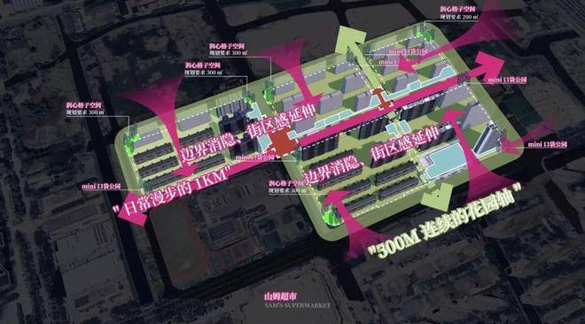 这些丰富的生活场景,则由两条景观轴线串联:一条是约300米的连续花园轴;一条是约600米的日常漫步街区。