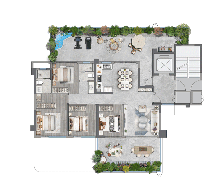 该户型配备 1 个或多个空中露台,并且采用错层设计。这种设计不仅避免了露台之间的相互遮挡,还营造出了真正的 “花园” 感。