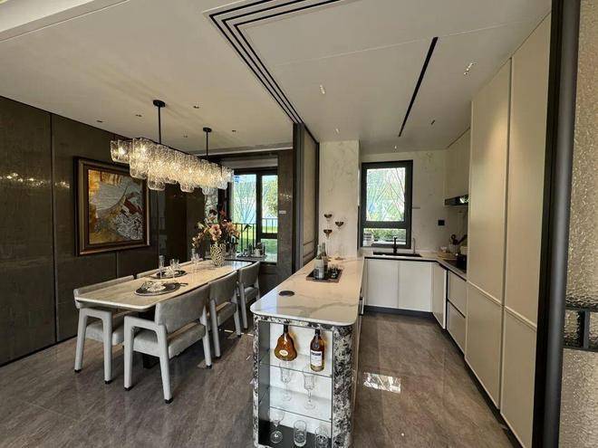 招商中旅·观境的解决方案是“零无效空间”。通过整合餐客厨等公共区域厅,将原来南北厅中间的走廊空间融合到使用空间中,减少过道的面积,避免碎片化的空间带来的冗余浪费。大面宽,短进深,餐厅与客厅横向相连,每一平方米都物尽其用,把客厅升级为家庭互动主场。