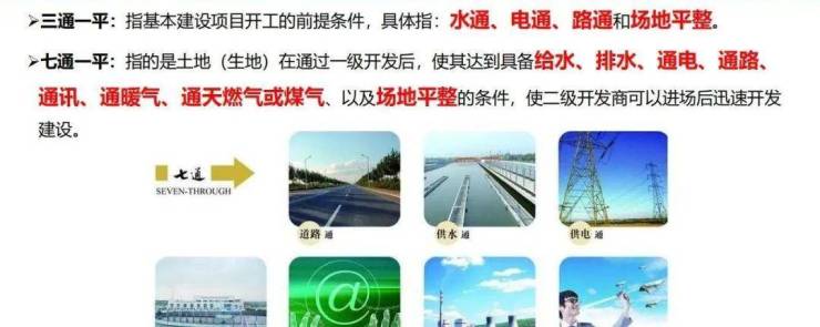 是指上、下水通,排污通、排水通、路通、通讯通、煤气通、电通及场地平整。