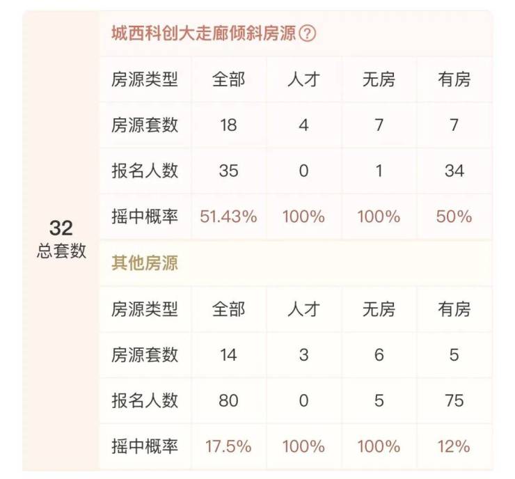 最终该批32套房源,吸引了115组家庭登记!其中廊外有房家庭中签率最低,仅12%。