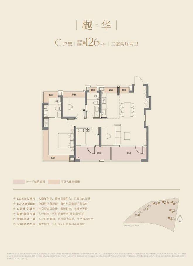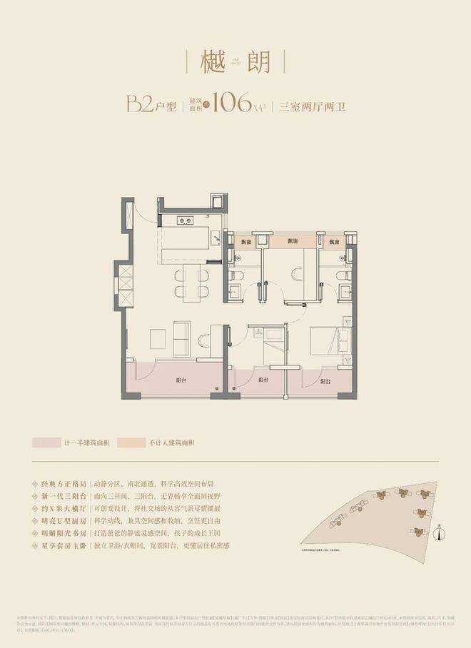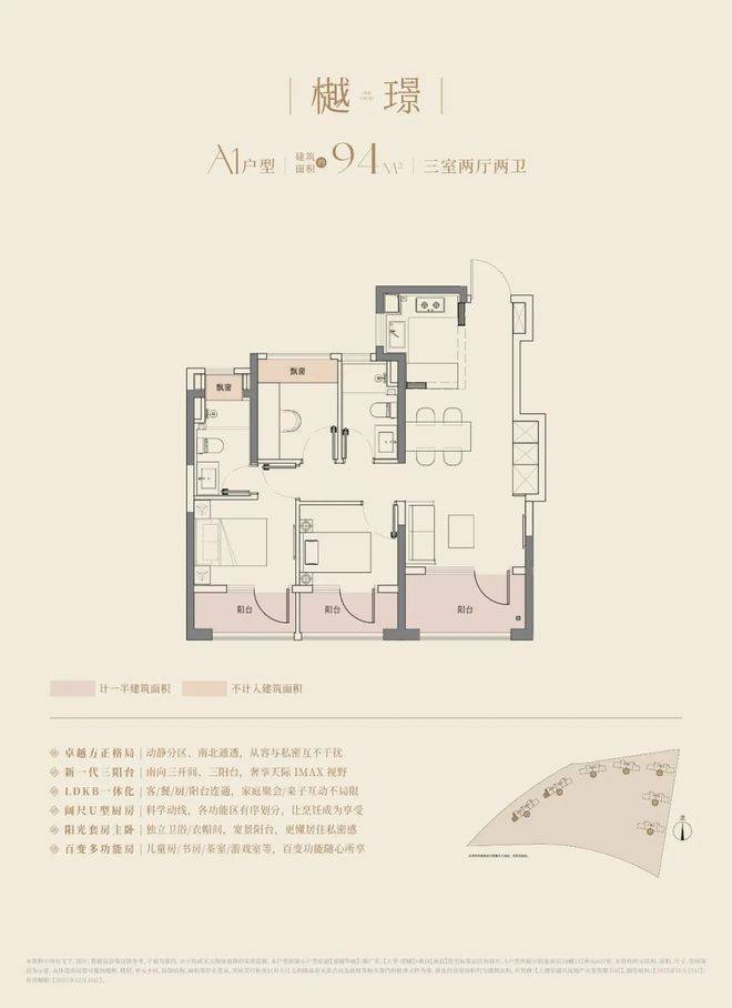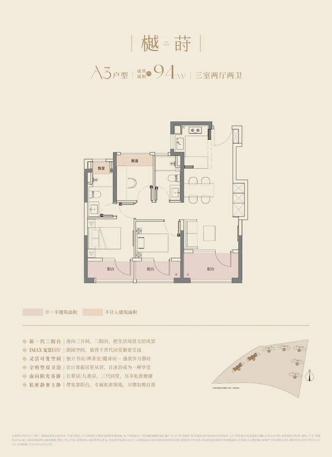 约94㎡起步户型:设计了市场上不多见的南向三阳台,凭借充足(约9%)的赠送面积,实现空间利用率最大化。