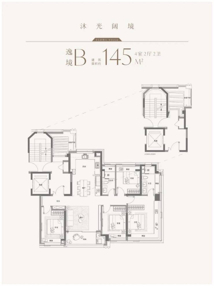 1、建面约145平户型热销且紧缺四房产品,类一梯一户设计,边套转角窗搭配超高窗墙比,采光通透,兼具功能与尺度的双重要求;
