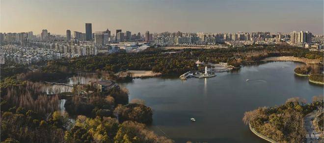 落日时可挽着爱人,一边漫步湖畔遛娃遛狗,一边看天边余霞成绮,湖中碎光点点,人与自然融为一体。