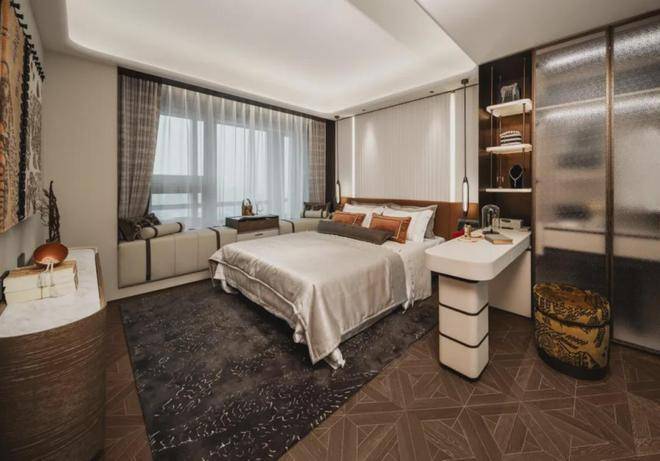 吊顶采用一体化大平顶加回型吊顶设计,并且在四个角均匀做了圆弧处理,让整个空间感更加和谐圆润。