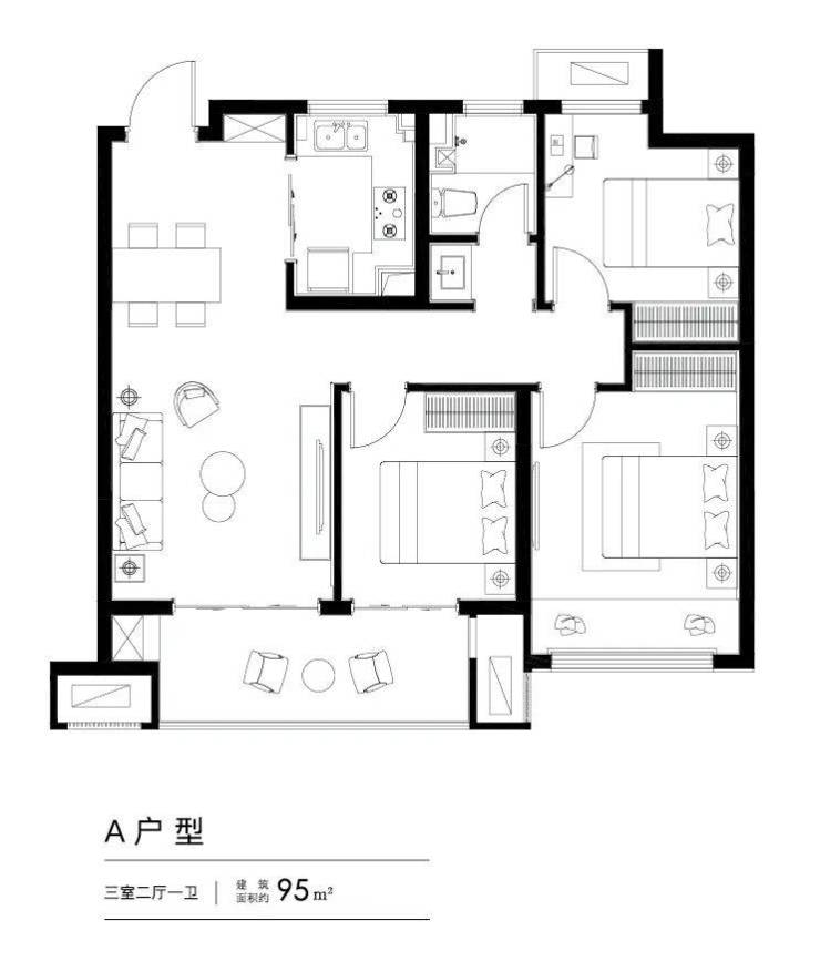 主力户型:3 室 2 厅 1 卫(95㎡)、3 室 2 厅 2 卫(108-109㎡)、4 室 2 厅 2 卫(128㎡)
