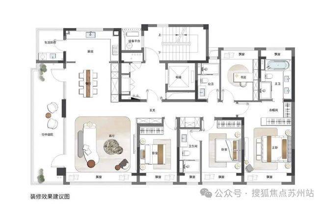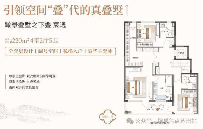 主卧套房,双衣帽间,三面采光;南向双开间阳台;双套房次卧;