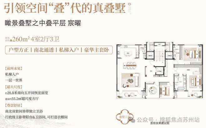 在这里我们要强调下它的平墅户型:该产品融合平层尺度与别墅功能,约20.8米南向五开间,超大尺度方厅达到约55.2㎡,私梯入户,“一层一世界”,南北双套房设计,不仅确保了每代人之间的居住独立性与隐私,更让每一位家人都能享有套间级的舒适与尊崇体验。