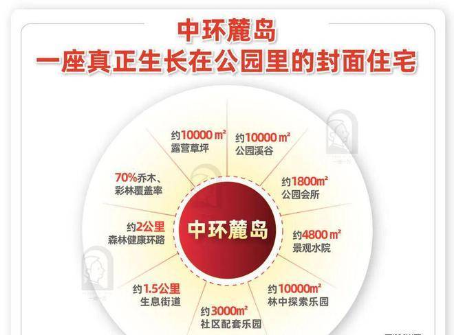 约10000㎡公园溪谷、约10000㎡露营草坪、 约1800㎡公园会所&约4800㎡景观水院、约10000㎡林中探索乐园、约3000㎡社区配套乐园、约1.5公里生息街道、约2公里森林健康环路,70%乔木、彩林覆盖率,勾勒出近万亩自然绿洲,让中环麓岛成为一座真正生长在公园里的封面住宅。