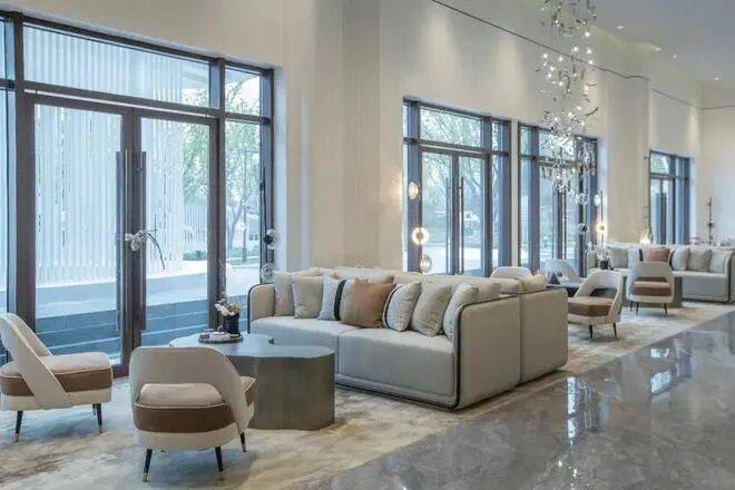 坚持“去风格化”产品标准,以大面玻璃栏板+横向铝型材线条的极简雅净,深色搭配局部香槟色系的美学风格,为太仓专筑现代国际艺术建筑群。