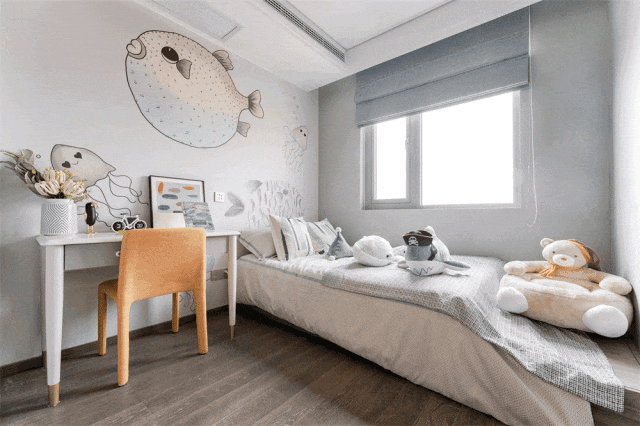 南向次卧可以作为父母房,安放他们的晚年生活;北向次卧,可以作为儿童房,放置学习桌等,让孩子拥有独立小天地。