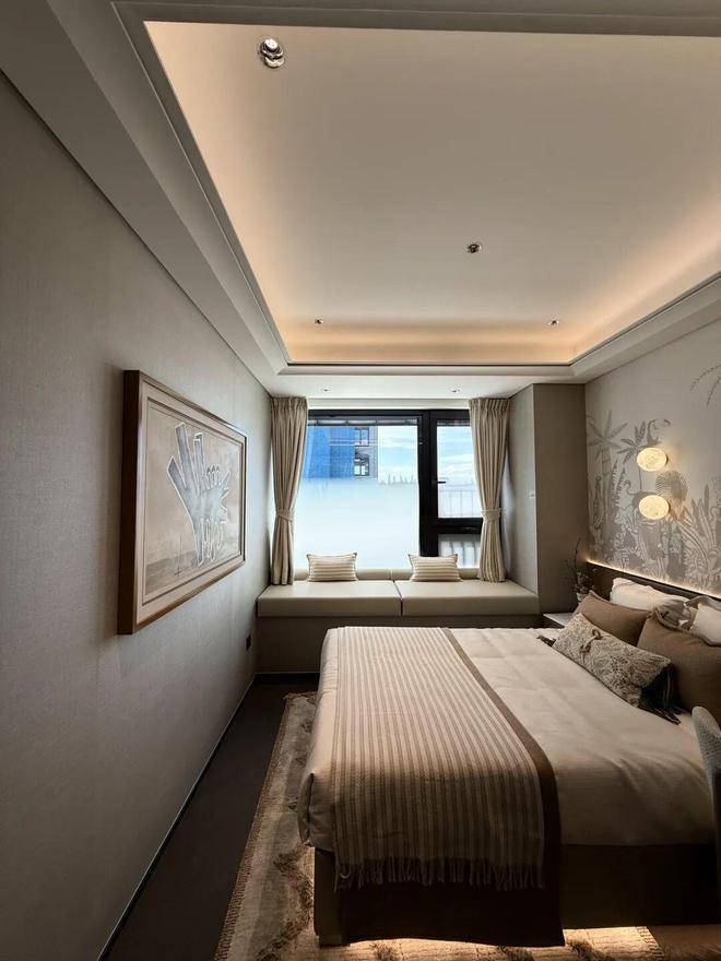 120㎡三房:动静分离设计,三开间朝南,配备6个飘窗增强采光,主卧含独立衣帽间、梳妆台及美妆冰箱。