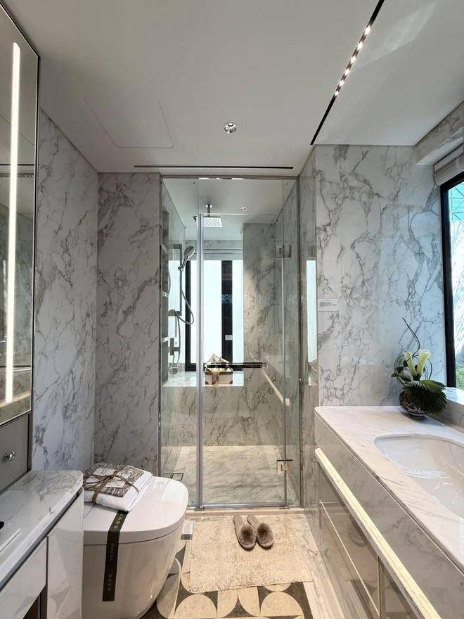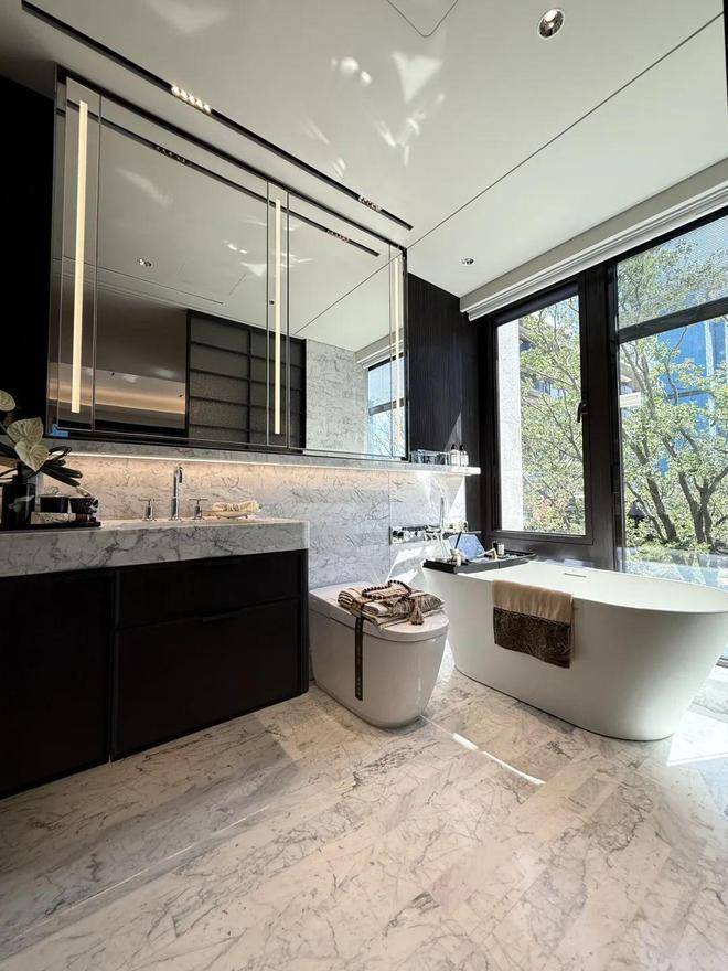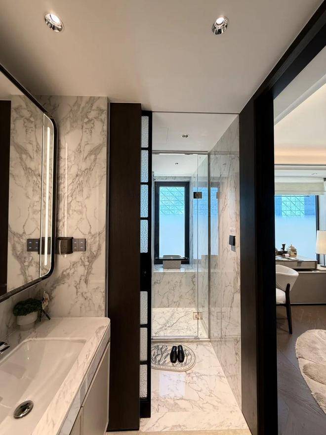 收纳细节上,二期户型中完美继承了一期的收纳系统,玄关收纳,整面内嵌柜体一直延伸到餐边柜;厨房全屋定制的柜体;卫浴的镜面柜和美妆冰箱等等,主卧卫生间的进一步升级:洗手台与化妆台相对,拥有三面镜柜,视觉空间进一步扩展和延伸。