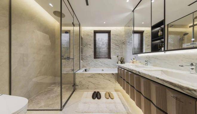 厨房配置美诺厨电5件套,中式大吸力油烟机、全嵌入式三眼燃气灶台、嵌入式冰箱、嵌入式蒸烤一体机、洗碗机;卫生间采用唯宝卫浴5件套,几乎是高奢酒店的标配。