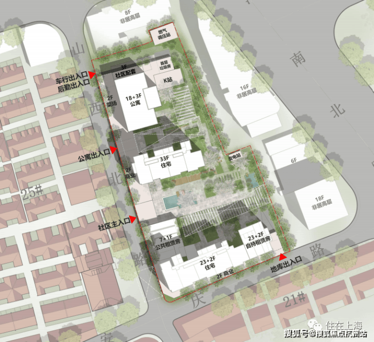 住宅就两幢楼,南侧楼栋总高25F,中间纯住宅楼栋33F,沿街和社区入口都包含了商业以及一些配套,当然其余还有杂七杂八的租赁、公寓房等等。