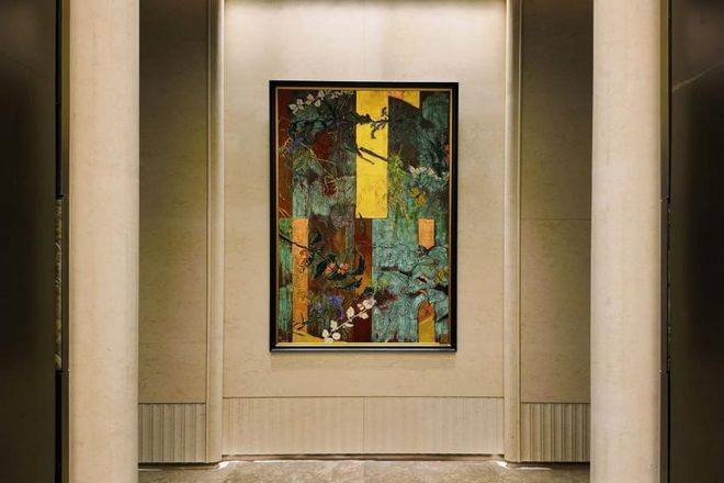 招商序运用圆弧形工艺切割、弧形倒角设计、非遗火烧金箔工艺、国家级非遗麦秆镶嵌工艺等,在大门、墙面、画作、沙发等诸多细节之中注入手工艺和非遗的痕迹,精细打磨费工费时,彰显对不可复制的敬重。