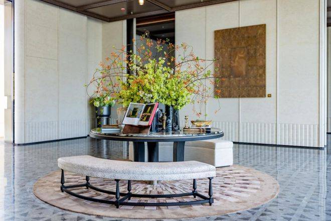 项目首层通过硬朗直线呼应柔和曲线勾勒,辅以温润石材与古铜色金属线条融合,打造东西方美学共融的艺术藏品。