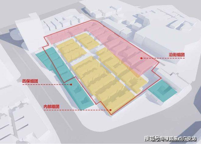 另外,从组团上看,分为历史保护组团、内部组团、沿街组团: