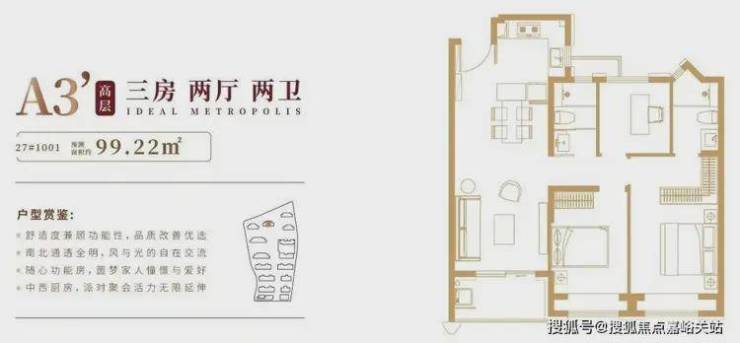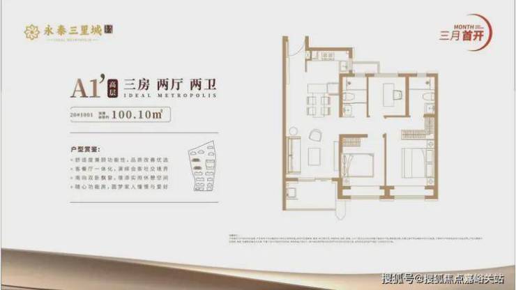 具体细节方面,项目目前只有一个建面约100㎡三房的样板间,带软装后面宽约3.3米,吊顶后层高约2.73米。